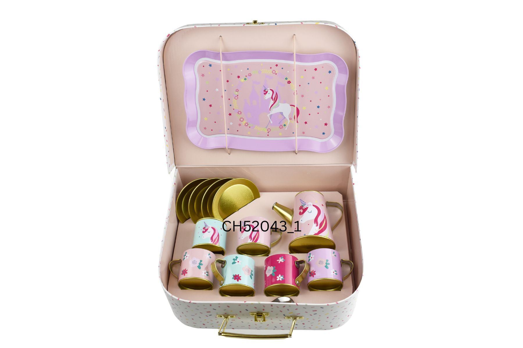The perfect tea set for your next tea party. This kids tin tea set is a sweet set featuring unicorn designs in pink tones your child will absolutely love. Perfect for pretend play with family or friends, or whether just to invite your favourite dolls or teddy bears, this tea set has everything you need to entertain your child’s guests!