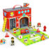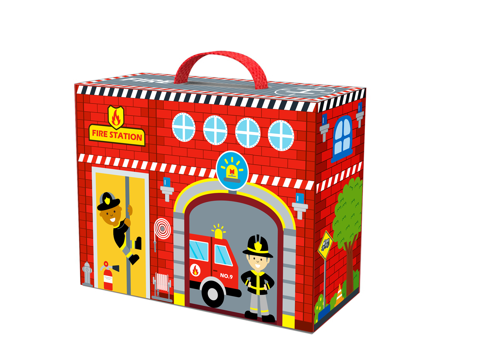 This is our lovely and well-made fire station travel box play set. Kids will be able to enjoy this set on the go. This play set lets young kids pretend that they are firemen. The front panel folds down and reveals the interactive play area. This box comes complete with firemen, fire truck, ladder, and accessories to compliment the scene. When finish playing the box folds up and everything can be stored inside and comes with a helpful handle on the top of the box. So, moving to the next play area is so easy.