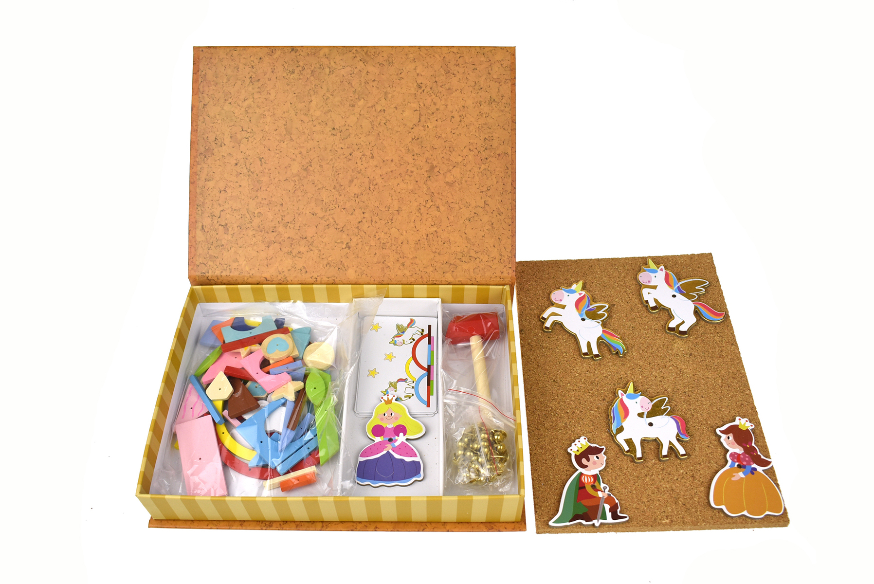 Each Tap a Shape set contains 1 cork board, 1 wooden hammer, 1 bag of nails , Design cards, 1 pack of cardboard Unicorns and faiytale characters and 1 pack of assorted wooden shapes (152 pcs in total).